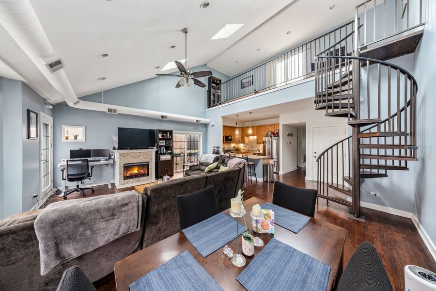 Stunning penthouse condo in the heart of River West, offering 2 bedrooms and 2 full baths with a seamless blend of style, space, and city living. This sun-drenched home features an expansive, extra-wide living area with soaring ceilings, skylights, and beautiful hardwood floors throughout.